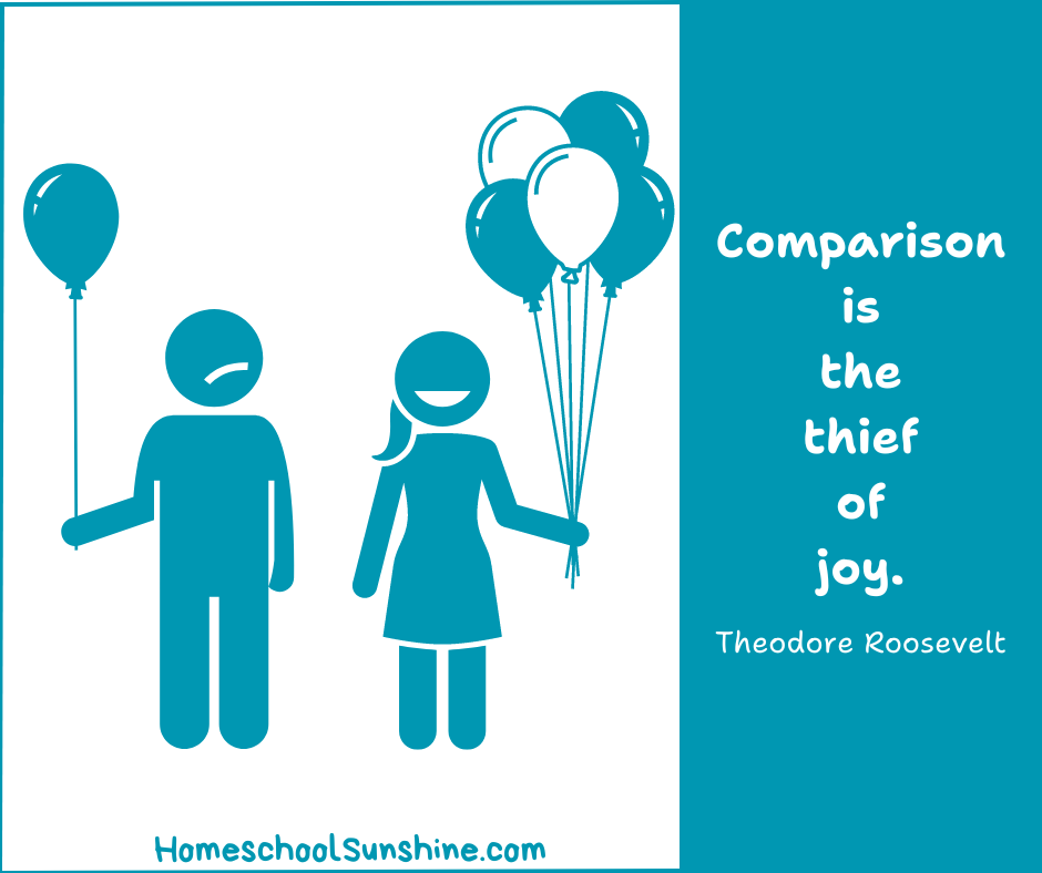 Are you wondering how to manage those feelings when they creep into your homeschool? Here’s what works for me. When I fall into the comparison trap, I remind myself that I would have to be a completely different person to have what someone else has. I would have a different husband, different children, different parents and siblings … and let me tell you, that is a *shock* to your system to picture your life without all the people that truly matter. That shock will flip your thinking and overwhelm you with an immense feeling of gratitude.